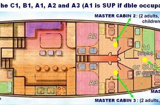 – 3 Master cabins in the front (queen-size bed + WC + shower) – One is triple.